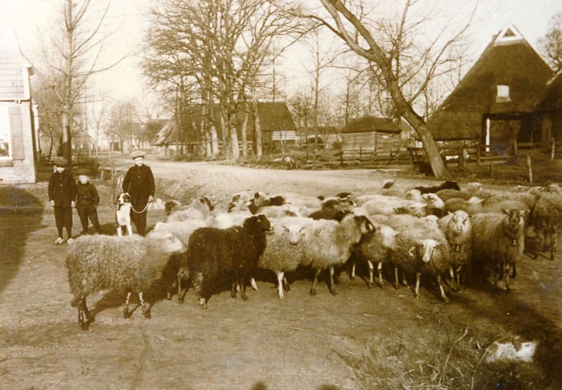 Een kudde schapen op weg naar het heideveld in 1910 Bruntingerstraat